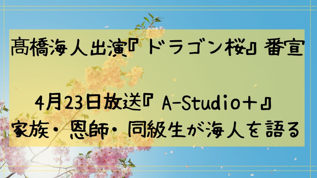 2021年4月25日(日)後9時から放送が決定しているTBS日曜劇場『ドラゴン桜』、King&Prince髙橋海人さんが出演します。 番宣でいろんな番組に出演する髙橋海人さん。 4月3日9:30~放送TBS「王様のブランチ」では、ドラマ直撃インタビューの様子が放送され...