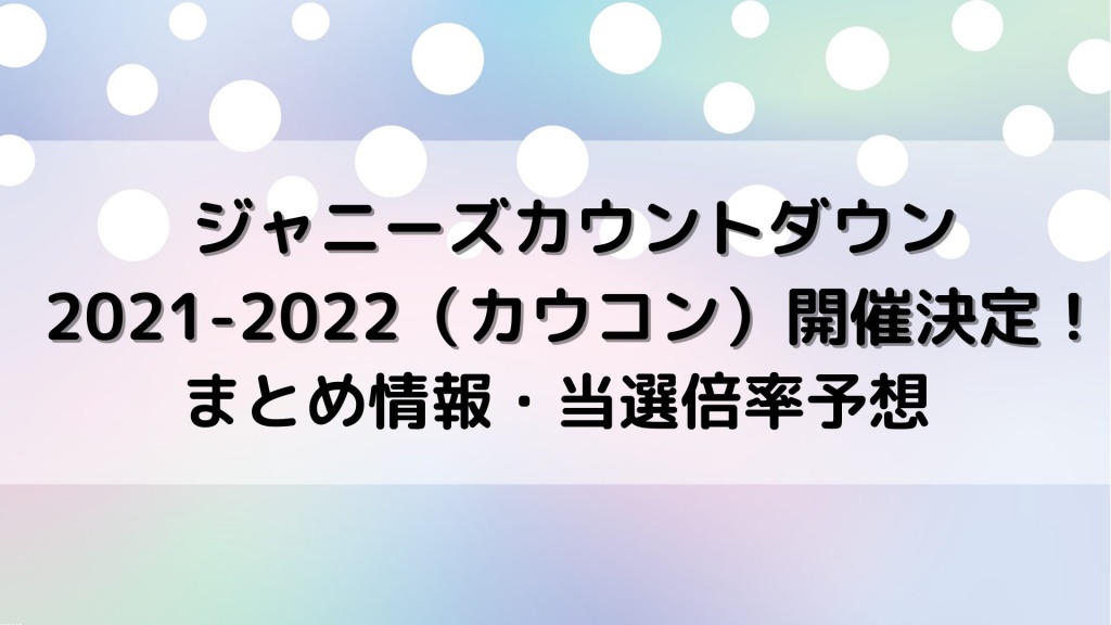 2021年12月31日23時から、今年も「ジャニーズカウントダウン2021-2022」(カウコン)が開催されることが発表されました! 「ジャニーズカウントダウン2021-2022」は、ジャニーズグループ14組とジャニーズJr. が出演します! カウコンはグループ単独コンサ... -